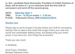 At a canvassing event promoted by the Broward Teachers Union, organizers told participants they had to wear masks.
