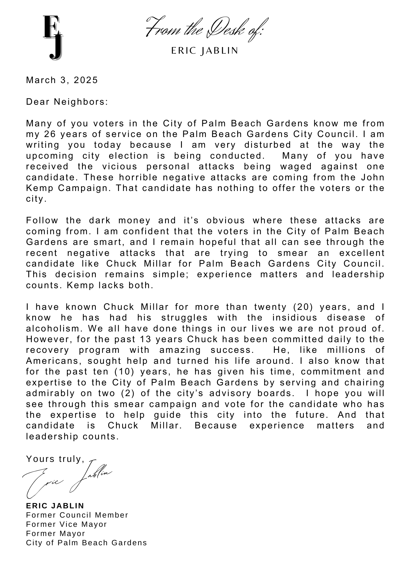 As the Palm Beach Garden City Council races get nasty, former PBG Mayor Eric Jablin has something to say.