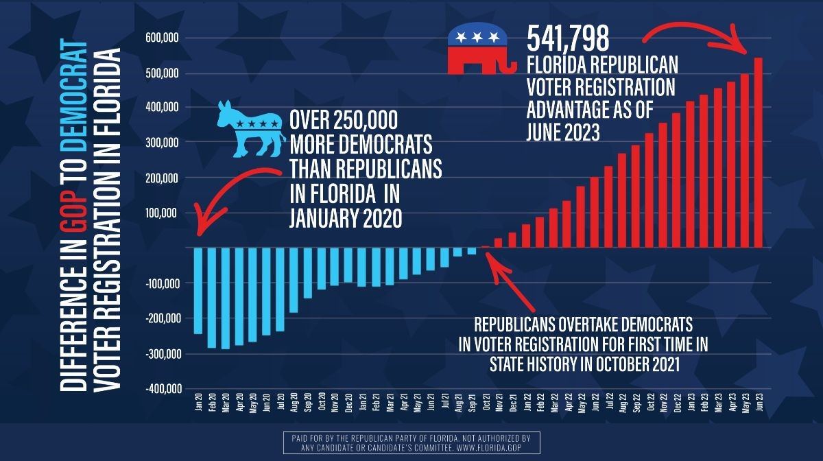 The GOP had 5,263,269 registered voters as of June 30, while the Democratic Party had 4,721,471, according to newly posted data on the state Division of Elections website. That 541,798-voter edge was up from a 496,150-voter advantage at the end of May.