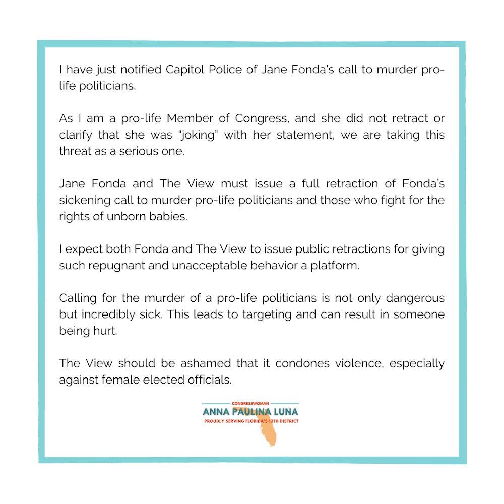 “I have just notified Capitol Police of Jane Fonda’s call to murder pro-life politicians,” Florida Rep. Anna Paulina Luna said in a formal statement. “I expect both Fonda and The View to issue public retractions for giving such repugnant behavior a platform.”