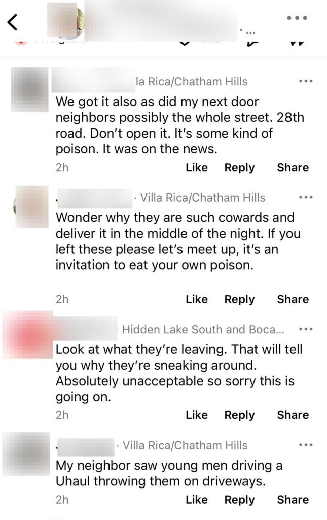 Residents in the Villa Rica/Chatham Hills neighborhood of Boca Raton posted messages and photos of the flyers on the community site Nextdoor.com. The flyers said,