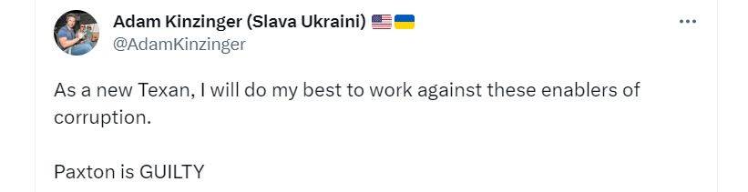 “Psst… Hey, Adam Kinzinger… The Paxton Trial was a sham… The evidence was 100% debunked… The Senate fully acquitted Ken Paxton