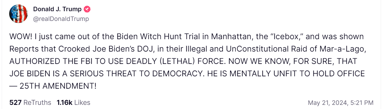 Shortly after the report, Trump responded on Truth Social, writing that Biden is “mentally unfit” to hold office. “WOW! I just came out of the Biden Witch Hunt Trial in Manhattan, the ‘Icebox,’ and was shown Reports that Crooked Joe Biden’s DOJ, in their Illegal and UnConstitutional Raid of Mar-a-Lago, AUTHORIZED THE FBI TO USE DEADLY (LETHAL) FORCE,” Trump said.