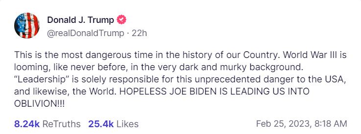 “World War III is looming, like never before, in the very dark and murky background,” the former president wrote on his Truth Social account. “‘Leadership’ is solely responsible for this unprecedented danger to the USA, and likewise, the World. HOPELESS JOE BIDEN IS LEADING US INTO OBLIVION!!!”