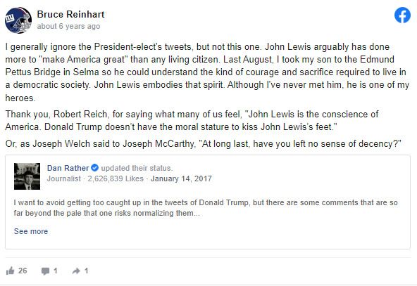 He not only praises Lewis but disparages Trump in his Facebook post, parroting liberal talking head Robert Reich’s statement that “Donald Trump doesn’t have the moral stature to kiss John Lewis’s feet.”